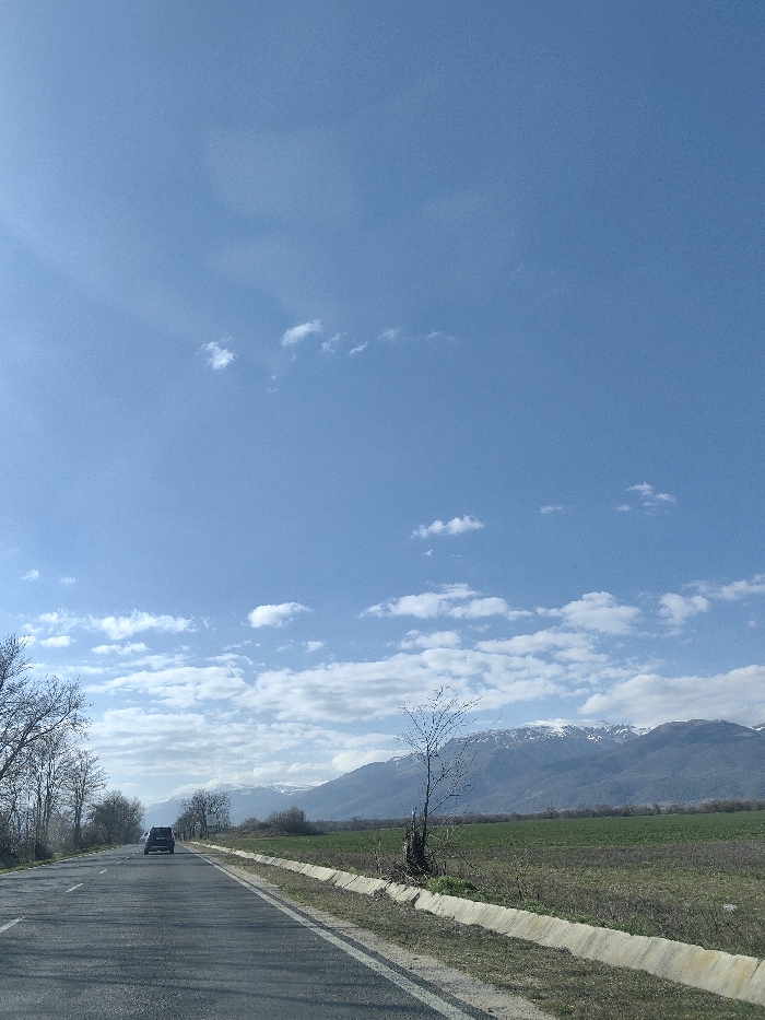 - "The scene depicts a rural road environment in the vicinity of Dolno Sahrane, Bulgaria, under a clear blue sky with scattered white cumulus clouds" by FM-tqeth1, licensed under CC BY 4.0