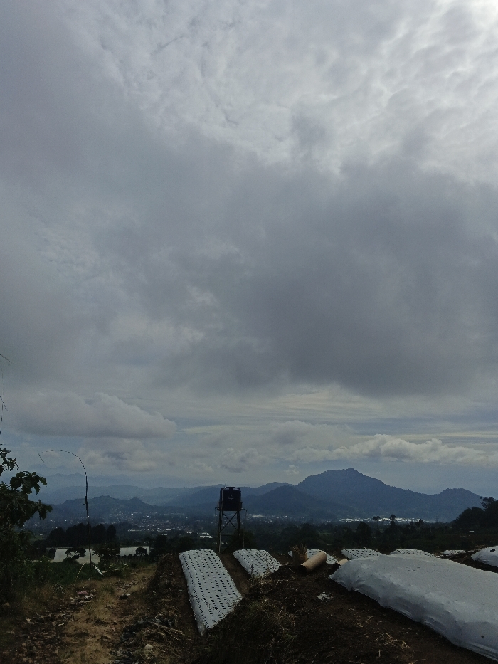 A landscape featuring rows of cultivated land with white covers in the foreground, leading to a valley with a distant town and hills under a cloudy sky. A metal water tank stands amidst the landscape. The scene is set against a backdrop of mountains. The dark, overcast sky suggests a potentially rainy or gloomy day.