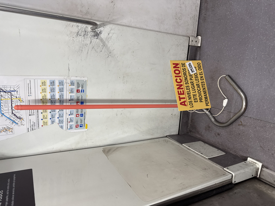 The interior of a train car displays a route map partially torn and obscured by a coral-colored bar. A warning sign is affixed to a metal handrail; the sign reads “ATENCION” with a message about noise levels and the risk of permanent hearing damage in Spanish. The train car walls show signs of wear and tear, with scratches and marks visible on the white surface. A gray step area is seen at the bottom corner.