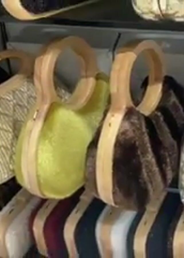display of women's handbags on a shelf. The handbags are arranged in a row, and each has a wooden handle. The bags are made of various materials, including velvet, sequins, and woven fabrics. The colors of the bags range from black to brown, yellow, green, red, and purple. Some of the bags are covered in plastic wrap. The shelf is white, and the background is blurry. There are sounds of people talking.