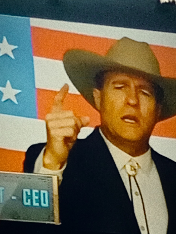 A man wearing a cowboy hat, bolo tie, and dark suit is gesturing with his raised index finger. He is positioned in front of a backdrop featuring a simplified American flag design with white stars on a blue field and red and white stripes. A sign partially visible in the lower-left corner displays "CEO" in green. The man's expression appears serious.