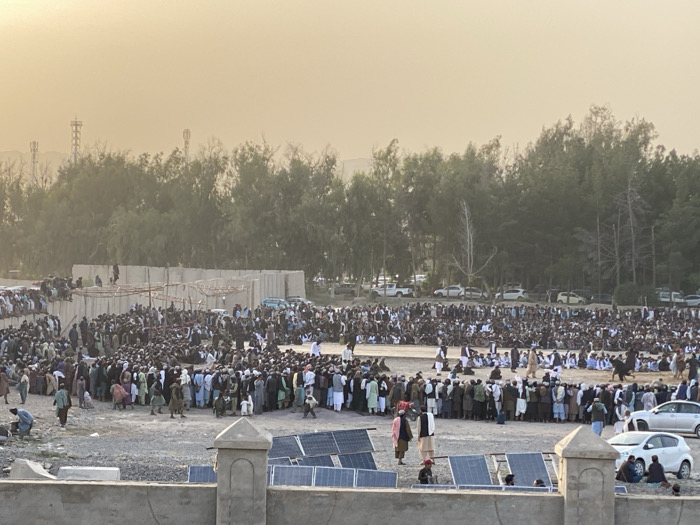 A large crowd of people, primarily men, are gathered in an open area near a concrete wall. They are watching something, but the subject of their attention is not clear. There are a few women scattered throughout the crowd, and several parked cars in the background. The scene is set in Sard-E 'olya, Afghanistan, located at latitude 31.717 and longitude 65.704. The sky is a light orange, suggesting the time is near sunset. There are a few rows of solar panels on the ground in the foreground. The environment is dusty and dry. Some of the people are wearing traditional clothing.