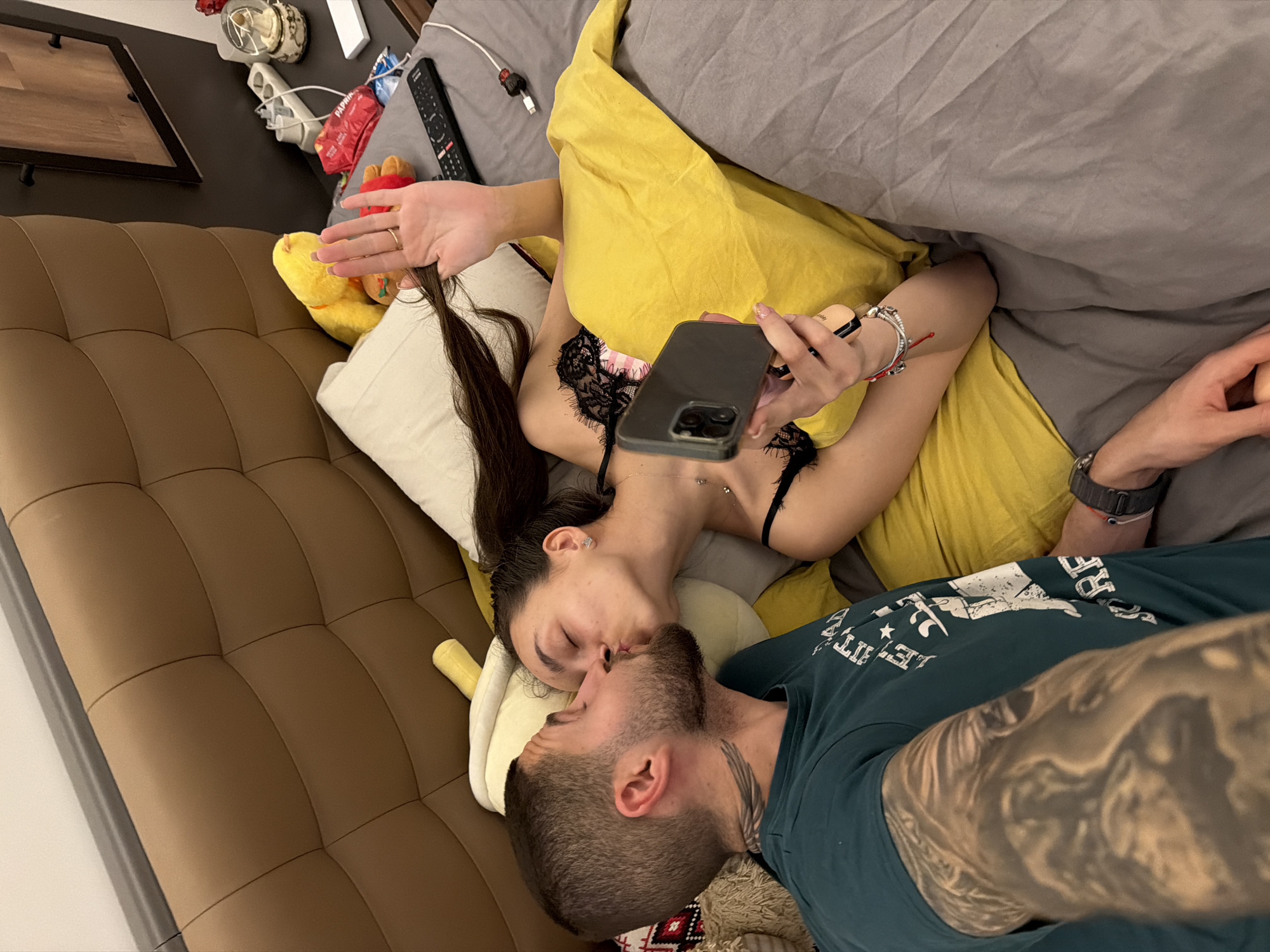 A man and a woman are lying on a sofa in a bedroom. The woman is wearing a black lace top and has long, dark hair. She is holding a mobile phone in her left hand and a makeup applicator in her right hand. Her left hand is raised above her. She is lying under a yellow blanket and a gray bedsheet. The man is wearing a green t-shirt and has tattoos on his arm. They are kissing. The sofa is brown and quilted. On the sofa, next to the woman, there are two pillows and two yellow plush toys. In the background, there is a television remote, a cable, and a framed picture. The image was taken in Sofia, Bulgaria.