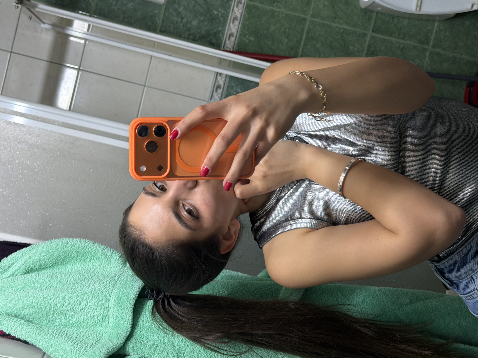 A woman takes a selfie indoors in a bathroom. She is holding an orange-cased smartphone and wearing a silver shirt, blue jeans, and a gold chain bracelet on one arm and a silver bracelet on the other. Her hair is dark brown and pulled back into a ponytail. She has red nail polish. The background shows a bathroom with green and white tiled walls and a shower area. The location is Rudartsi, Bulgaria, based on the available information. A green towel is also visible.