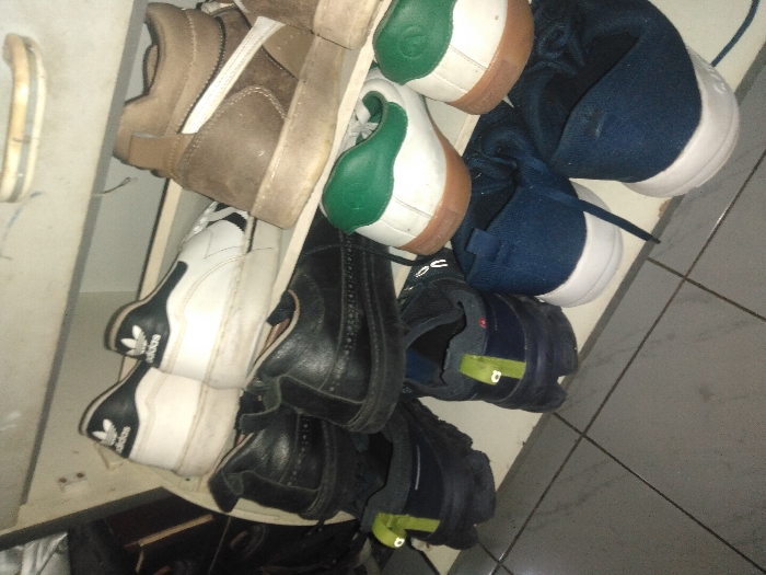 The scene captures an interior view of a shoe storage area in Turmero, Venezuela, featuring a multi-tiered, light-colored shoe rack