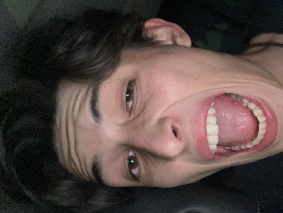 A person with dark hair and brown eyes stares directly into the camera with an exaggerated expression. Their mouth is wide open, revealing a full set of teeth and tongue. Forehead wrinkles are prominent, suggesting strain or amusement. The face is positioned at an unusual angle. The background is dark and blurry.