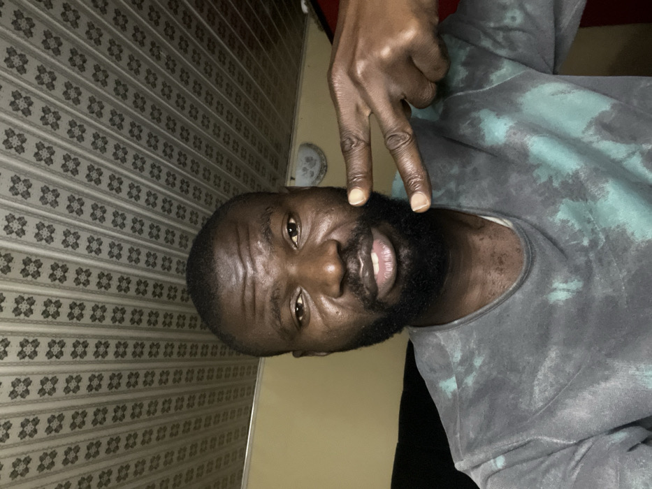 A man poses for a selfie, making a peace sign. He has dark skin, a short haircut, and a full beard. He is wearing a gray and turquoise tie-dye sweatshirt. The background features a wall with a repeating floral pattern and a small circular object. The image is slightly rotated.