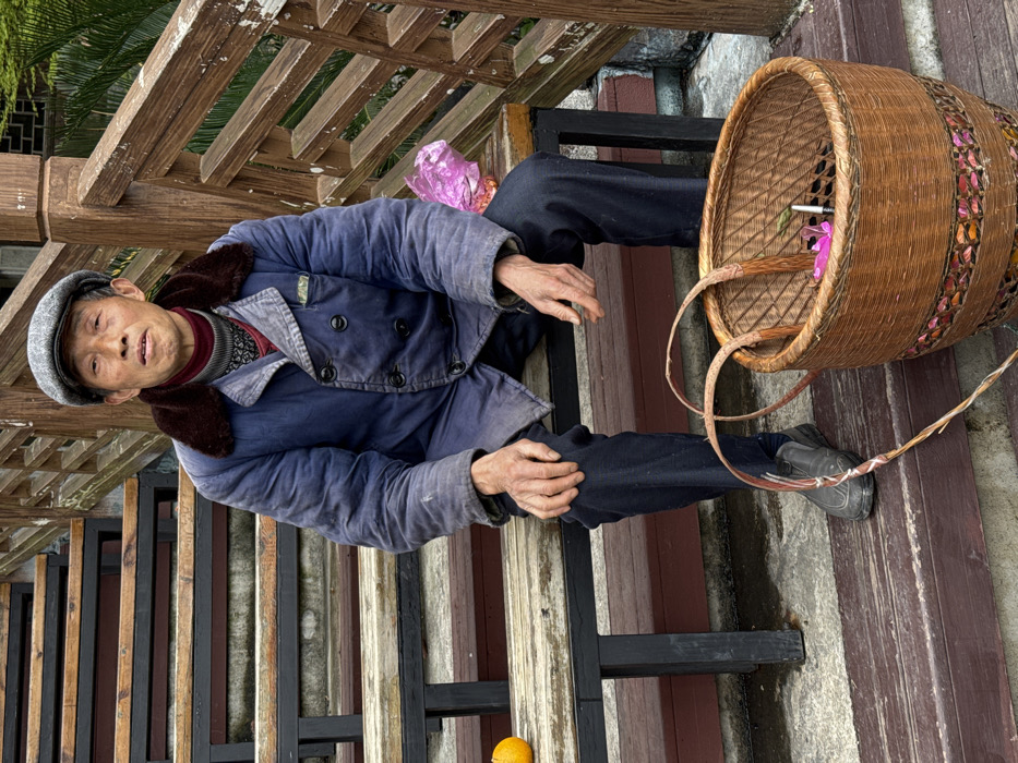 An elderly East Asian male, appearing in his 60s or 70s, is seated on a light-colored wooden bench with black metal supports, part of a multi-tiered wooden staircase structure in Furong, China