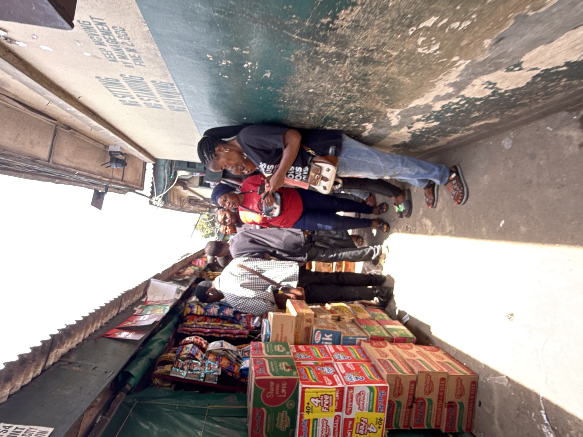 The image depicts an outdoor scene in what appears to be a narrow, crowded street, possibly in Lekki, Nigeria, given the products and signage visible