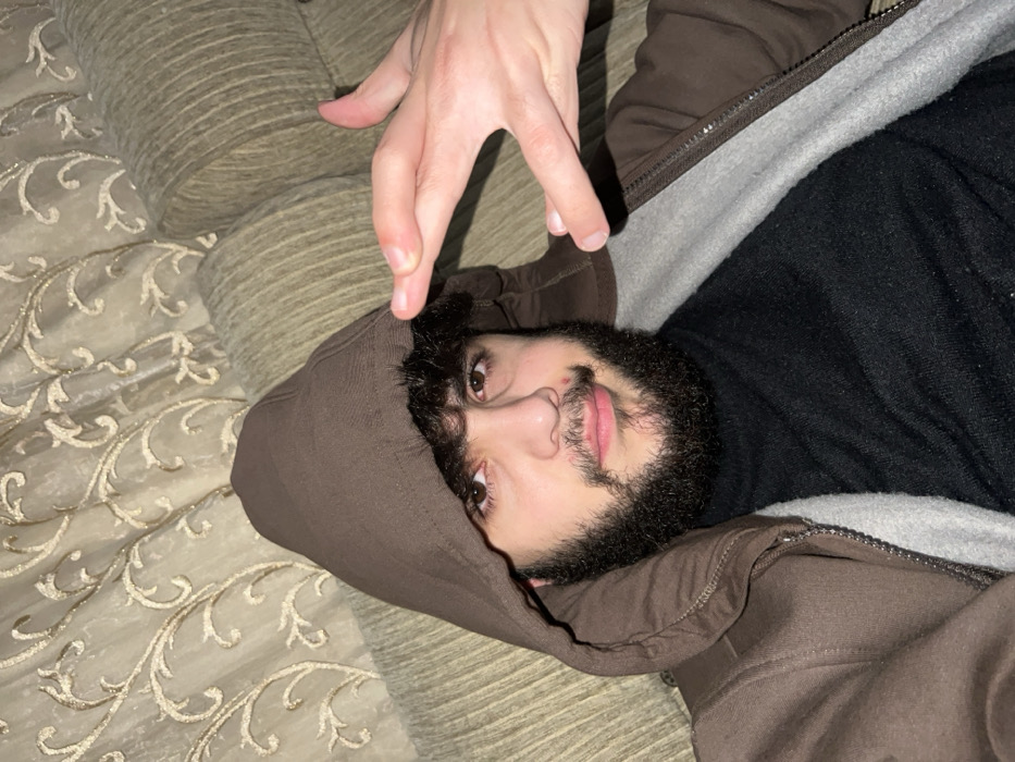 A man with a full beard lies on patterned upholstery. He is wearing a black sweater under a brown hoodie and jacket. His hoodie is pulled up over his head. A pale hand hovers over his forehead. The man’s eyes are visible, and he appears to be looking at the camera. The upholstery on the left side of the frame has an elaborate, repeating floral pattern. The rest of the upholstery has a subtle texture.