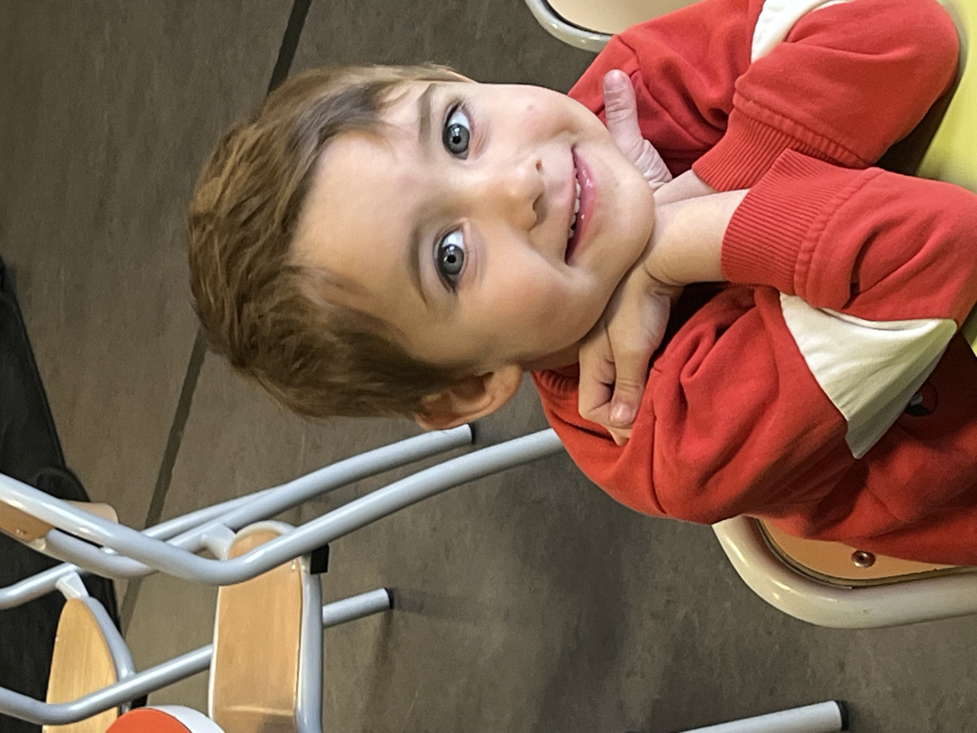 A young, light-skinned child, identified as male, is depicted from the mid-chest up, seated in an indoor setting in La Fouillouse, France