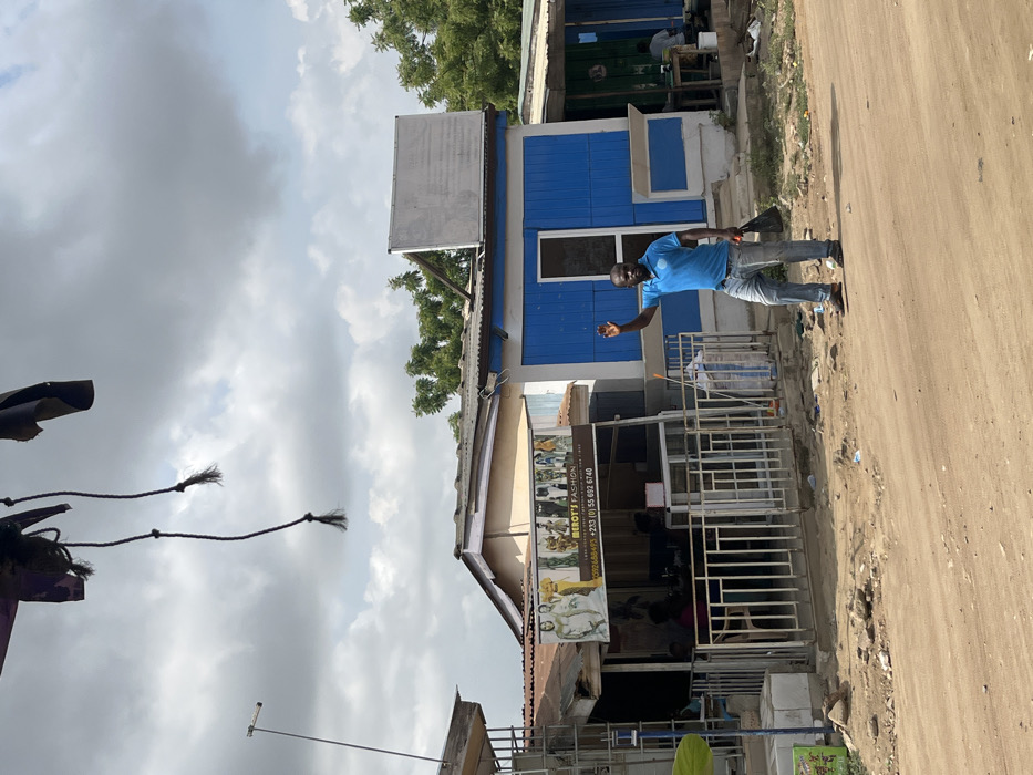 An outdoor scene in Ngleshi Amanfro, Ghana, depicts a street with buildings under a cloudy sky
