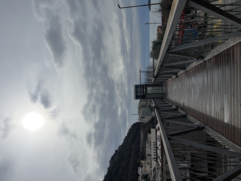 The image depicts an elevated pedestrian walkway in Budva, Montenegro, extending towards a contemporary elevator structure under an overcast sky. The walkway, constructed of metallic railings with diagonal bracing and a wet, slatted dark brown surface, recedes into the background. The central elevator structure features glass panels and a metallic door. To the left, a steep, dark green and brown mountainside is visible, with white and light-colored buildings nestled at its base and ascending its slopes. To the right of the walkway, urban buildings are present, beyond which a calm, grey-blue sea stretches to the horizon. A small island or landmass is discernible in the distant sea on the right. The sky is largely covered with grey clouds, but a bright, circular sun is visible at the upper left, casting a strong glare. The scene is devoid of people or visible activity. A sailboat mast and some leafless trees are visible near the waterfront on the right, along with a street light post. Below the walkway on the right, partial red and white signage is visible.