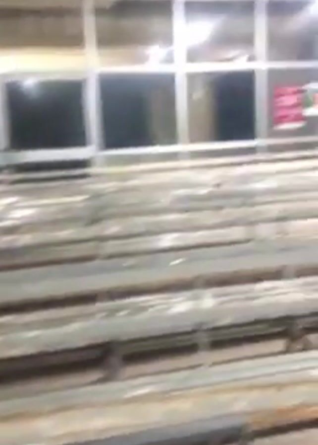 The camera moves through a brightly lit waiting area, possibly in a transportation hub or a large office building