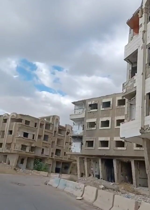 street lined with bombed-out buildings, likely the result of a war or conflict. The buildings are heavily damaged, with missing walls, shattered windows, and collapsed sections. The road is cracked and littered with debris. A car drives along the street. The sky is cloudy.