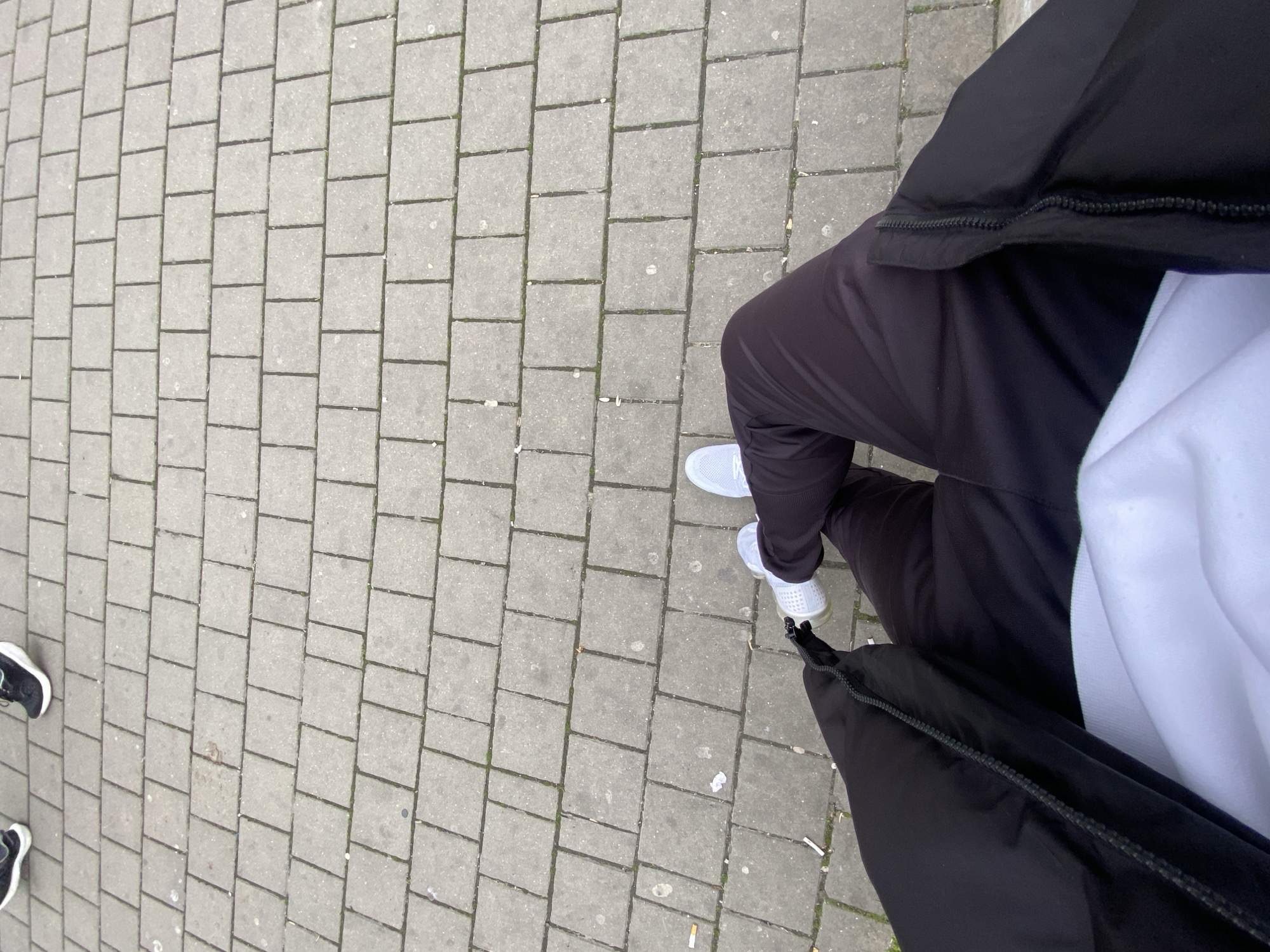 person standing on a paved surface, likely a sidewalk or pedestrian area. The person is wearing dark-colored pants, a white sweatshirt, a black jacket, and white shoes. Some cigarette butts are scattered on the pavement. The location is unknown, and there is no information connecting it to Varna, Bulgaria.