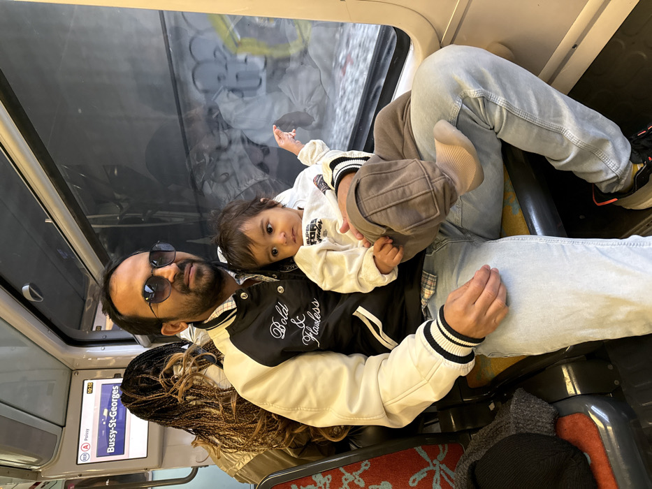 Inside a RER A train carriage, an adult male is seated, holding an infant on his lap