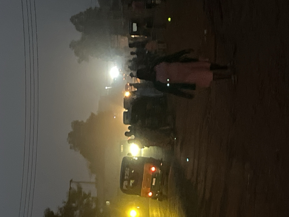 A street scene at dusk or night. Hazy conditions obscure the background, where blurry lights and indistinct figures suggest vehicles and pedestrians. A light-colored building is visible in the distance. Closer, a dark vehicle with illuminated tail lights is on the right. On the right, a person in a light-colored top walks along the side of the road. The overall impression is one of a busy, urban environment in low light and limited visibility.