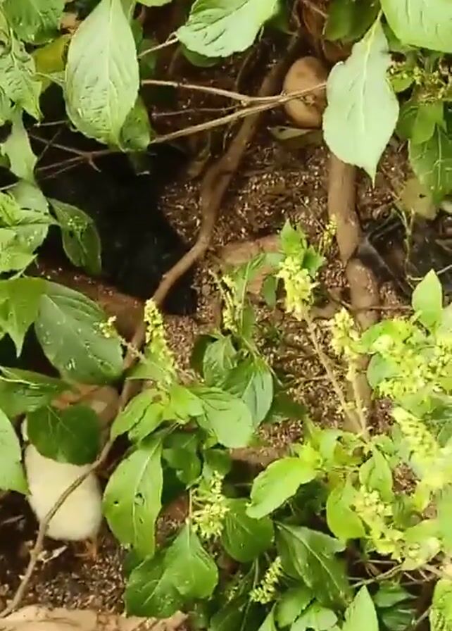 small white chick hiding amongst green leafy plants, twigs, and brown ground. The chick initially appears partially concealed, but it moves slightly within the foliage, revealing more of its body. The camera angle is from above, looking down into the plants where the chick is hidden.