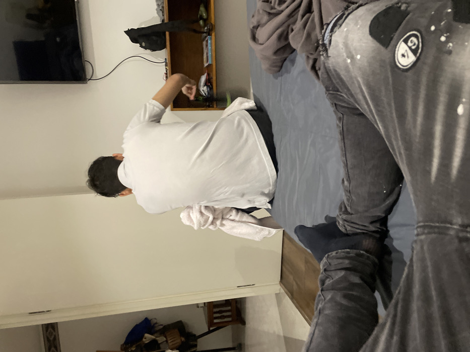 A dimly lit room features a man in a white shirt sitting on a blue bed, facing a wall with a mounted TV and a shelf. The man is positioned towards the center-left of the frame, his back visible. A grey sweater rests on the bed near his feet. In the foreground, a person is wearing dark grey jeans and dark socks, with the denim pants partly obstructing the view. A small, dark wooden shelf sits below the bed by a white wall.