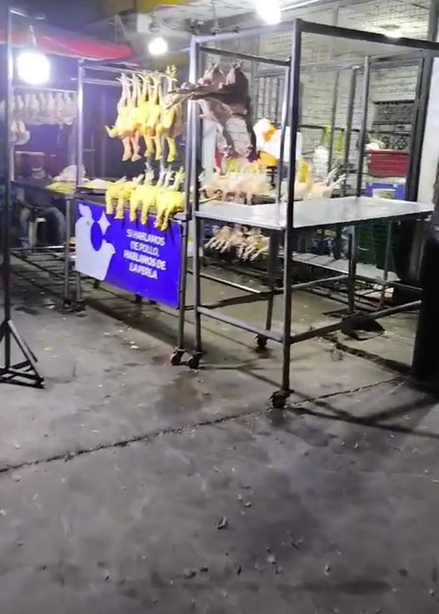 roadside chicken stall at night. The stall is illuminated by bright overhead lights, which cast a stark glow on the gray concrete ground. The stall consists of several stainless-steel tables and a metal frame structure. Rows of plucked chickens hang upside down from the metal frame, with more laid out on the tables. A blue sign attached to the stall displays the message "SI HABLAMOS DE POLLO, HABLAMOS DE LA PERLA". To the left of the stall, a person is seen sitting on a bench, facing away from the camera. Behind the stall, other objects and structures are visible in the background. The environment appears urban, and the overall atmosphere is functional rather than aesthetic.