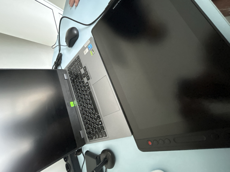 The image displays an overhead perspective of a workstation featuring electronic devices on a light blue desk surface. No specific location within the city of Varna, Bulgaria, can be determined from the visual information provided. A silver-grey laptop, identified as a Lenovo model with Intel Core i5 and NVIDIA RTX stickers on the palm rest, is open and centrally positioned. Its dark screen reflects ambient light, and a green sticker marked "01" is present below the screen. The keyboard exhibits both Latin and Cyrillic characters. Directly in front of and partially overlapping the laptop's palm rest is a large, black Huion drawing tablet, also with a dark, reflective screen. The tablet features a column of programmable buttons along its left edge, with the top button displaying a red power icon. The "HUION" logo is visible on the upper right bezel of the tablet. To the right of the laptop, a black wired computer mouse rests on the desk. A partial view of a human right hand, oriented palm down, is visible on the desk surface next to the mouse. On the far left, a black pen stand holding a stylus is partially visible near the laptop. In the upper-left background, a black power strip with multiple outlets is present, connected by cables. The background primarily consists of a plain white wall or a window frame structure on the right side.