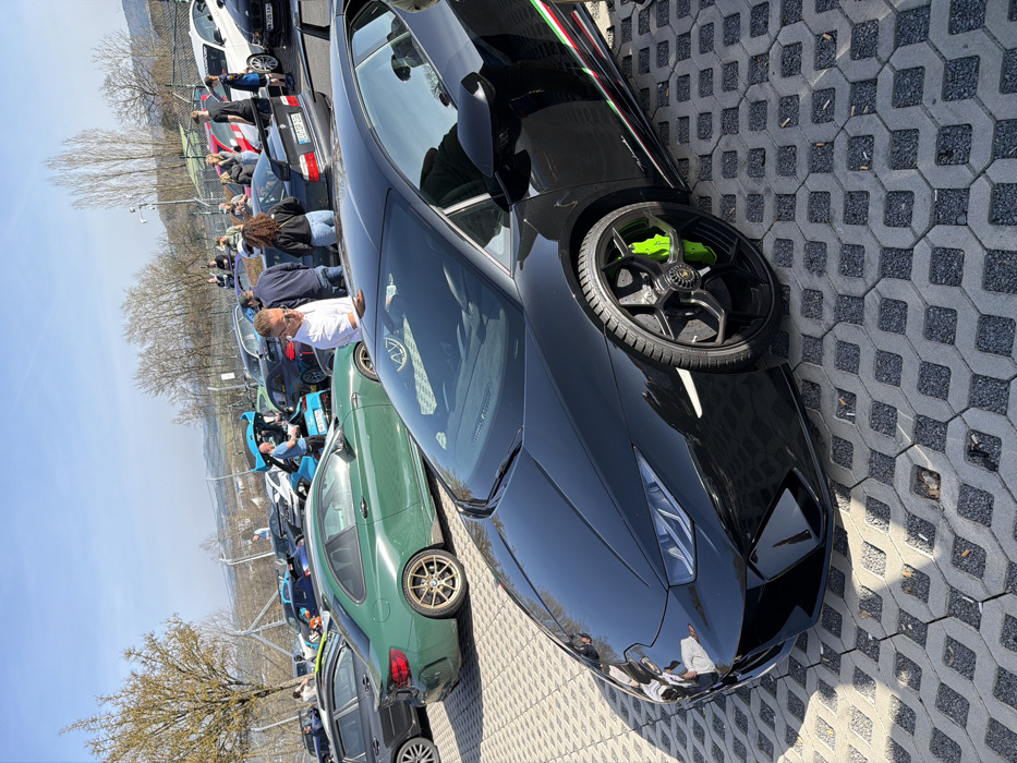 The image depicts an outdoor car gathering in Meuspath, Germany, under a clear, sunny sky