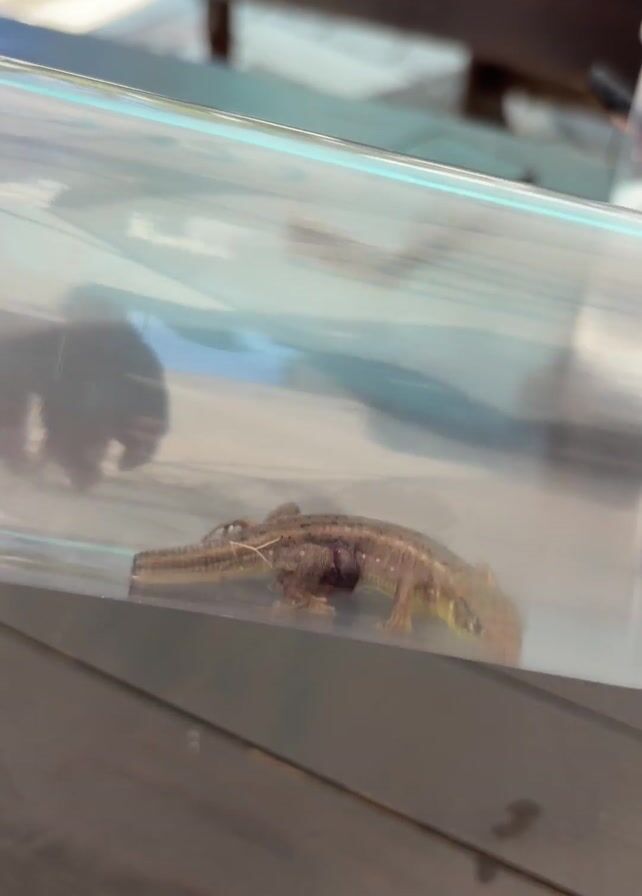 - "A small brown lizard is contained within a clear plastic cylinder on a dark gray wooden surface" by FM-uQTN23, licensed under CC BY 4.0