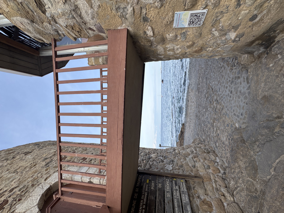 The image depicts a narrow outdoor passage between two stone buildings in Saint-Tropez, France, offering a view towards the sea. An elevated, reddish-brown wooden walkway with vertical balusters connects the upper levels of the two rugged stone-block buildings, spanning the passage below. The stone walls exhibit varied light brown and gray tones, with irregular masonry. On the left stone wall, a weathered wooden sign is affixed, indicating "COMMUNE DE ST TROPEZ" and "SENTIER DU LITTORAL," along with directional arrows and distances to locations such as "PORT," "ST TROPEZ," "CANEBIERS (2.7Km, 0H50Mn)," and "TAHITI (12Km, 3H25Mn)." A yellow marker symbol is visible next to "SENTIER DU LITTORAL." On the right stone wall, a white rectangular sign with a black QR code displays French text, notably "Baterie d'artillerie," suggesting a historical artillery battery location. The ground within the passage is composed of uneven, dark grey cobblestones and larger natural rock formations, leading directly to the water's edge. Beyond the passage, the Mediterranean Sea is visible under a light blue sky with minimal cloud cover. The sea surface is moderately choppy, with small waves breaking near the rocky shoreline. Several distant boats, including what appears to be a sailboat, are discernible on the water. No individuals are present in the scene.