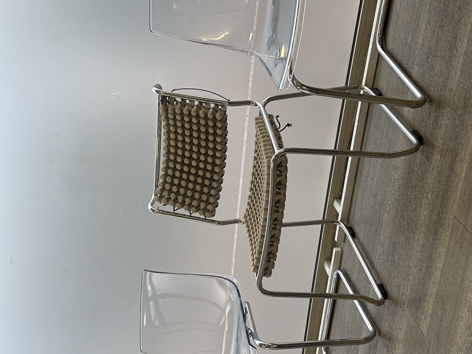 The scene depicts an interior view within Saint-Germain-en-Laye, France, showcasing three unoccupied chairs positioned in a row against a light-colored background, likely an opaque window or wall. The flooring is composed of dark brown, wood-patterned material. From left to right: 1. A partial view of a transparent, clear plastic chair with a chrome-plated tubular metal frame, exhibiting a cantilever design. Only the left side of its backrest and seat is visible. 2. The central subject is a complete chrome-plated tubular metal chair, also featuring a cantilever design. Both its seat and backrest are fitted with tan or beige-colored textured pads. These pads are composed of numerous small, rounded, dome-shaped protrusions arranged in a uniform grid pattern, fastened to the chair frame with black cords visible on the sides. 3. A partial view of a third transparent, clear plastic chair, similar in design to the first, with its right side cut off by the frame. A horizontal white bar or frame runs along the bottom of the light-colored background, approximately at the height of the chair legs. The environment appears clean and well-lit, with no individuals present. No actions or interactions are depicted.