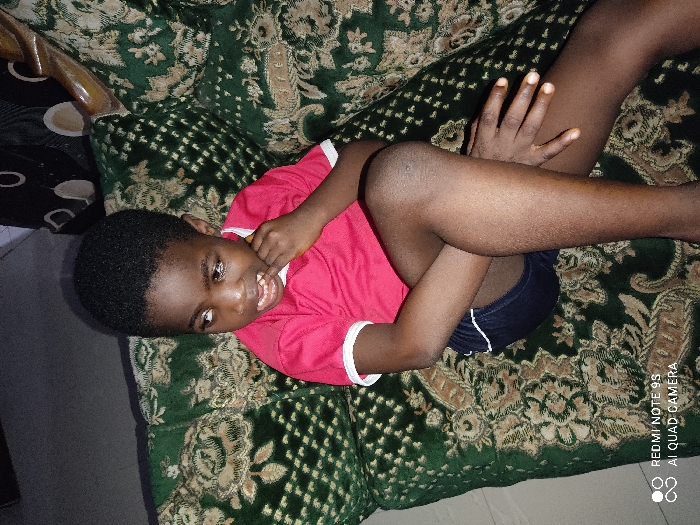 - "A dark-skinned child, approximately 4-7 years old, with short black hair, is seated on a green patterned sofa in a residential indoor setting" by FM-XgKum1, licensed under CC BY 4.0