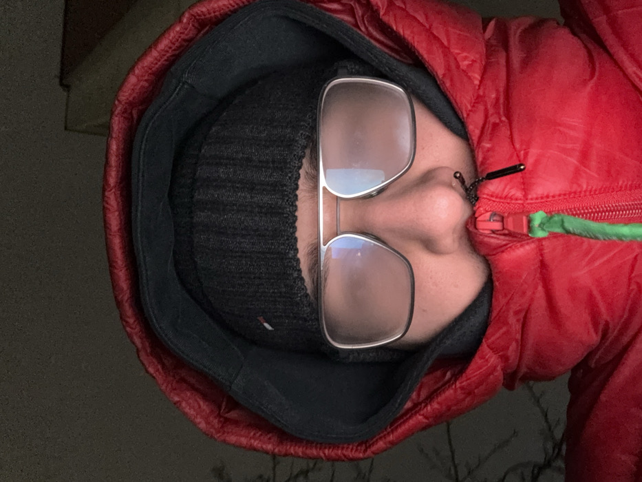- "A person wears a gray beanie, glasses, and a red puffer jacket with the hood up" by FM-Y52513, licensed under CC BY 4.0