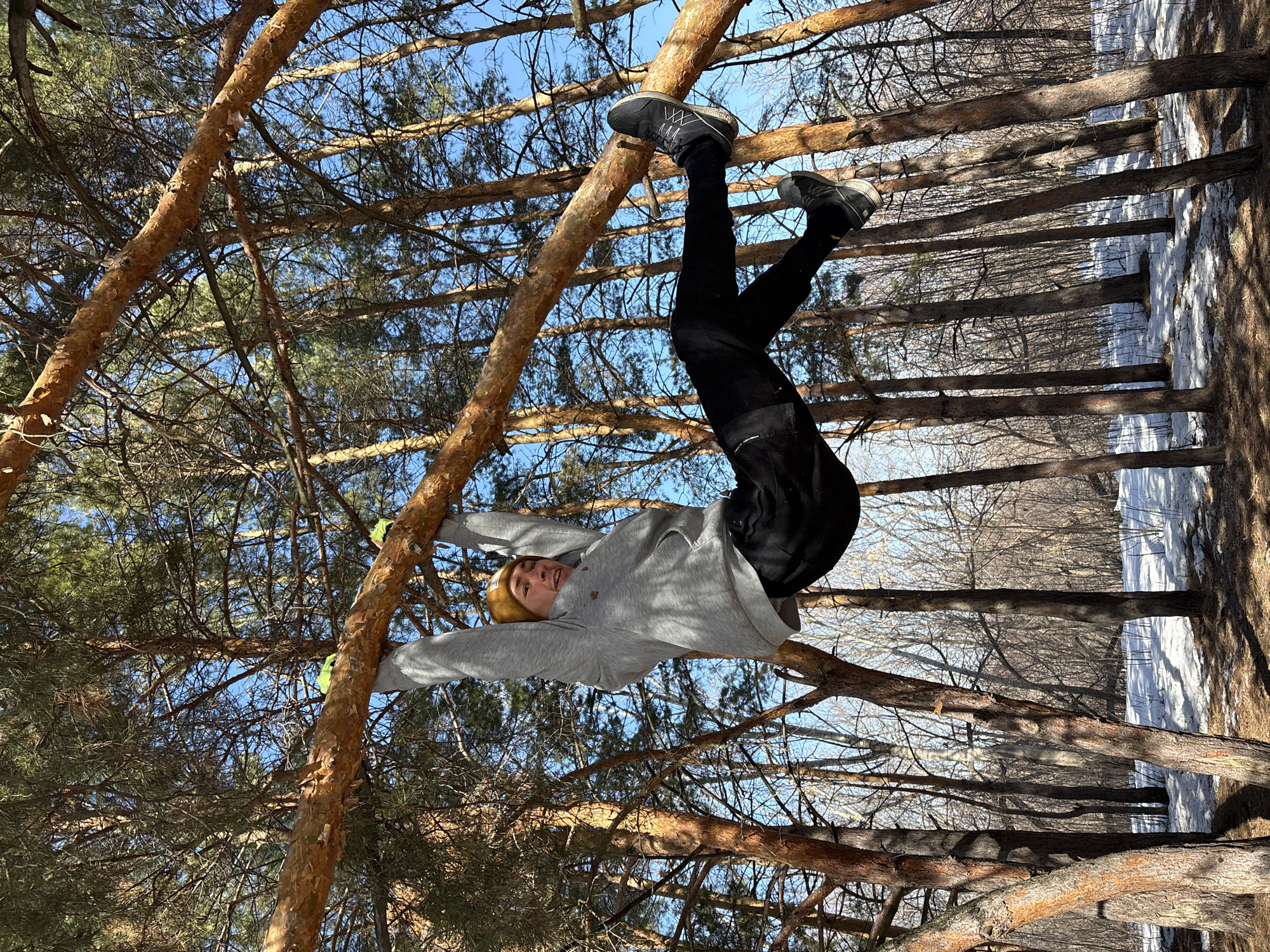 A young man is hanging upside down from a tree branch in what appears to be a wooded area. He is wearing a grey hooded sweatshirt, black pants, black shoes, a yellow beanie, and light green gloves. He is holding onto the branch with his hands. The background shows a forest with some snow on the ground and a clear blue sky visible through the trees. Location unknown.