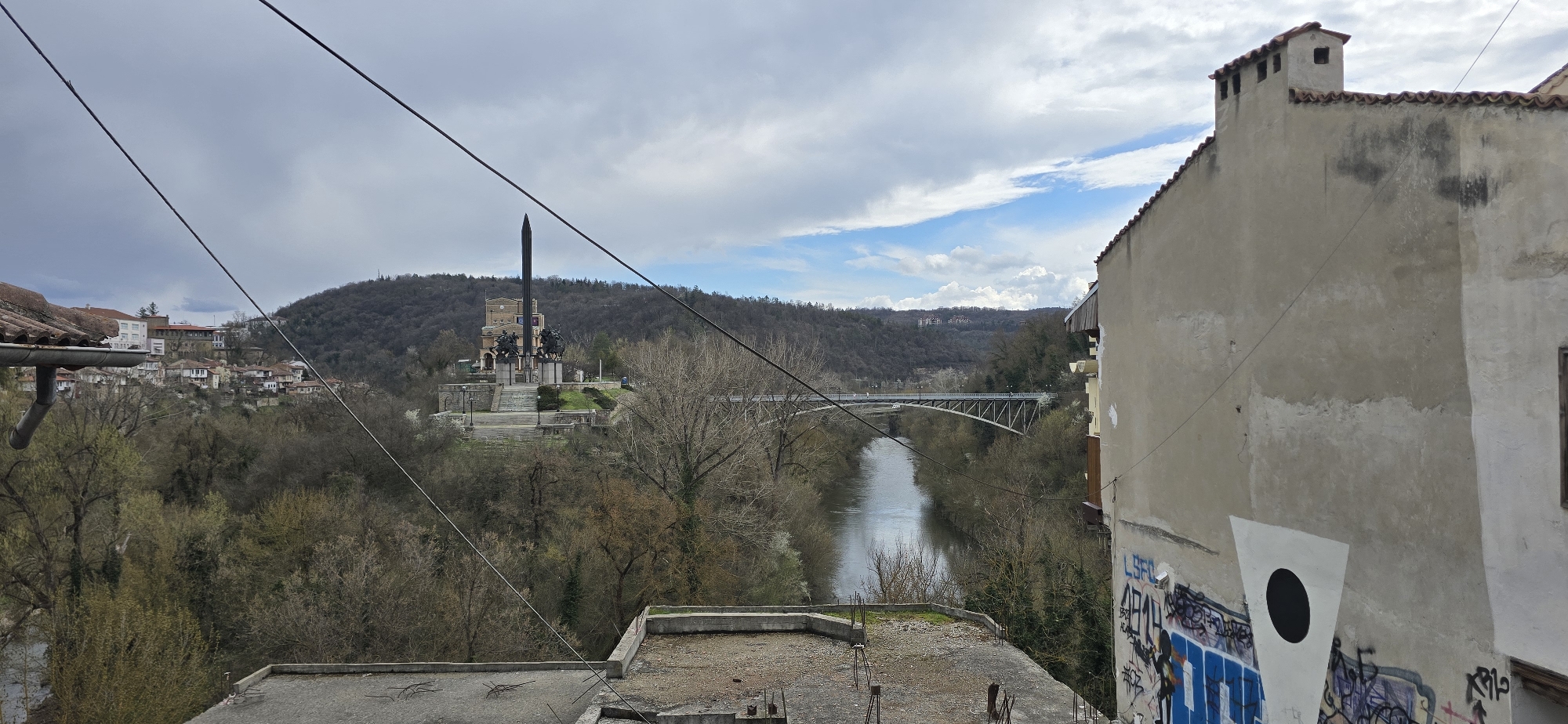 This image presents a panoramic view of Veliko Tarnovo, Bulgaria, under an overcast sky with patches of blue. In the immediate foreground, to the left, a section of a terracotta-tiled roof with a gray metal gutter is visible. To the right, a weathered, light-colored building wall occupies the frame, displaying dark stains, areas of peeling paint, and graffiti tags, including "LSFC", "0414", "DOP", and a prominent white triangular shape with a black circle. A partial wooden window frame is also visible on this wall, which culminates in a red-tiled roof and a multi-flue chimney structure at the top right. Below, a flat, dilapidated concrete rooftop or terrace shows exposed rebar. Multiple dark, slender cables or wires traverse the upper and mid-sections of the scene diagonally. The midground features the Yantra River, flowing from left to right, its surface reflecting the cloudy sky. The riverbanks are lined with dense, deciduous trees, mostly bare or showing early signs of spring foliage. On the far bank, prominently positioned, is the Mother Bulgaria Monument, consisting of a tall, dark, obelisk-like central structure flanked by equestrian statues, all situated on a tiered stone platform with surrounding green lawns and steps. Further downriver, an arched metal truss bridge (Stambolov Bridge) spans the Yantra. In the background, densely wooded hills rise, predominantly covered in bare trees. On the far left hillside, a cluster of traditional houses with red roofs is visible. On a more distant hill to the right, several modern buildings are discernible amidst the trees. The sky is largely covered with gray and white clouds, with areas of brighter blue showing through towards the right horizon. No people are visible within the frame.