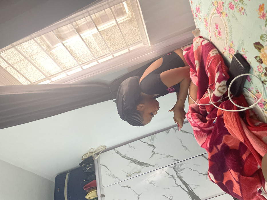This image depicts a residential interior located in Abuja, Nigeria. A young woman is seated on a bed, positioned in profile facing left. She has braided hair covered by a dark satin bonnet and is wearing a black, open-backed crop top. Her hands are held close, and she appears to be examining or manicuring her fingernails. The bed features a floral patterned bedspread, predominantly light blue or green with pink and white flowers, and is partially covered by a red and pink patterned blanket. A white charging cable and a dark rectangular object (possibly a power bank or external hard drive) rest on the blanket. In the background, to the left, is a white wardrobe or cabinet with a grey and black marble-like pattern and gold-colored handles. On top of this cabinet, a dark blue suitcase, several small colorful purses or clutches, and a light-colored sandal are visible. To the right of the woman, a large window with metal security grilles and textured glass panels is visible, letting in bright natural light. Dark curtains are partially drawn over the window. The walls are light-colored.