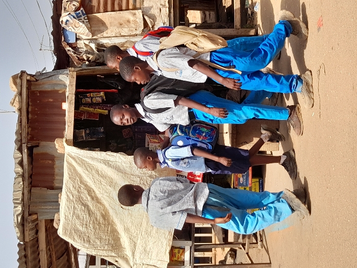 - "Five young individuals, likely male students, walk leftward on an unpaved dirt path in Kakuri Gwari, Nigeria, under clear daylight" by FM-DUSI23, licensed under CC BY 4.0