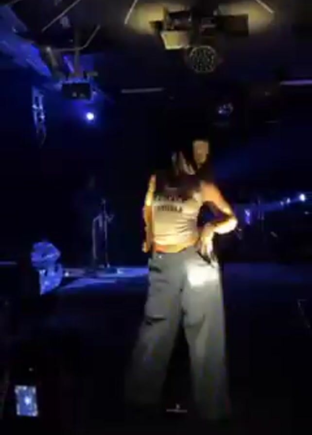 A female performer dances on a stage under bright blue and white spotlights. She wears a white tank top with the phrase “FEMALE TROUBLE” and loose, pale green pants. She moves her arms and poses, at times placing her hand on her head or hip. The audience is visible in the foreground, some holding phones to record the performance. The ceiling has a geometric design of lines and hanging lights. There are speakers visible on the sides of the stage.