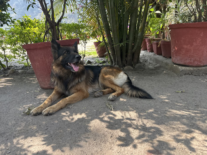 A sable and tan German Shepherd dog is observed lying on light brown dirt ground in Jonk, India. The dog rests with its front paws extended forward and head slightly raised, looking towards the right side of the frame, with its tongue partially visible. Its long, bushy black and brown tail rests on the ground behind it. Directly behind the dog is a large, reddish-brown terracotta planter. A cluster of dense green foliage and slender tree trunks provides partial shade, casting dappled shadows across the foreground. In the midground and background, additional reddish-brown pots of varying sizes, containing diverse green plants, are arranged. Faint outlines of distant green hills are visible under a bright sky in the upper left background.