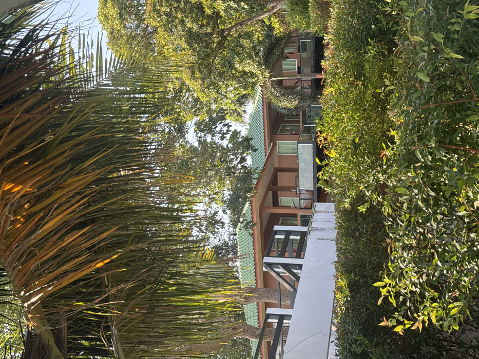 The image displays a tropical resort environment in Ban Ko Li Pe, Thailand, under clear daylight conditions. The foreground is characterized by dense, drooping palm fronds, exhibiting green and yellowish-brown coloration, which partially obscure the view. Below the palm fronds, a thick, vibrant green hedge or shrubbery occupies the lower frame. In the midground, a building complex with a reddish-brown exterior and bright green tiled roofs is visible through the surrounding foliage. The structure appears to be composed of multiple units, each featuring a covered patio or balcony equipped with dark-colored railings and clear glass panels. Large windows or glass doors are discernible on the building's facade. A white wall with dark wooden railings runs horizontally on the left side of the midground, partially obscured by foreground vegetation. The background is filled with numerous green trees beneath a light blue, clear sky. No individuals, actions, or interactions are present in the scene.