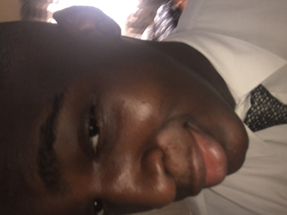 A close-up portrait depicts a dark-skinned male, estimated to be in his late teens or early twenties, indoors