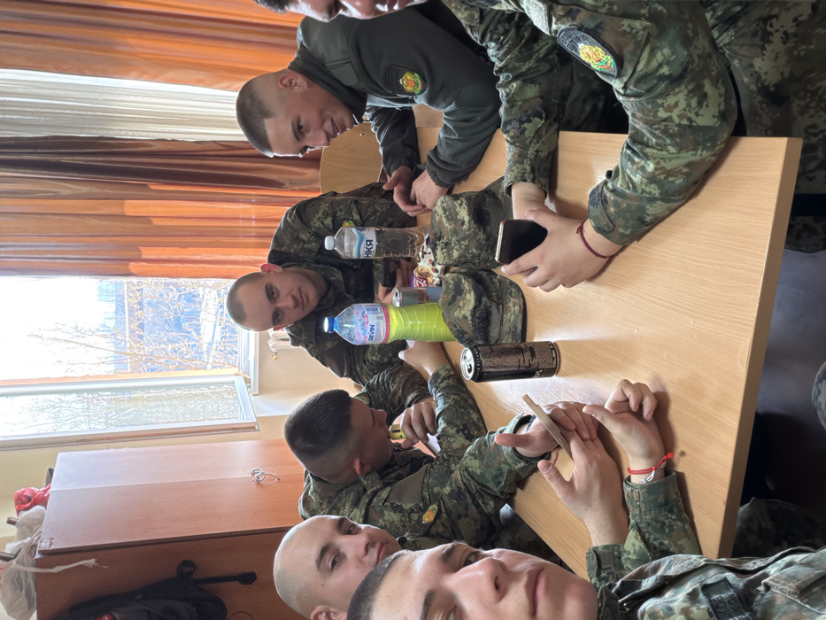 - "Six young men in Bulgarian military camouflage uniforms are seated around a light-colored wooden table in an indoor setting, likely a barracks or common room within a military or police academy in Sofia, Bulgaria" by FM-vgBCu1, licensed under CC BY 4.0