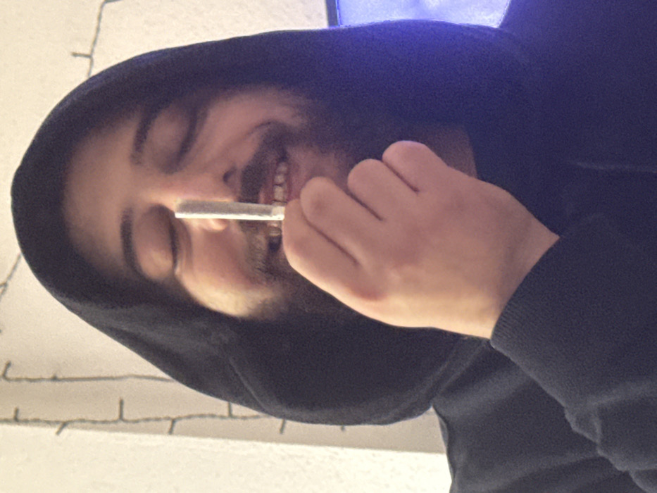 A close-up, chest-up shot of a single male subject in an indoor setting within Strasbourg, France. The subject, appearing to be an adult male in his 20s or 30s, possesses dark hair and a beard, and wears a dark-colored, likely black, hooded sweatshirt with the hood pulled up covering his head. His eyes are closed, and he displays an open-mouthed smile, revealing a full set of teeth. He is holding a slender, white cylindrical object, approximately 7-8 cm in length, vertically in front of his face, positioned centrally beneath his nose. The object's texture suggests tightly rolled paper. His right hand, with fingers curled, supports the lower end of the object. The subject's left arm and torso are partially visible. The background consists of a light-toned wall. String lights with small, spherical bulbs are faintly visible on the upper left portion of the wall. A diffused blue light source is present on the right side of the frame, possibly from an electronic screen.