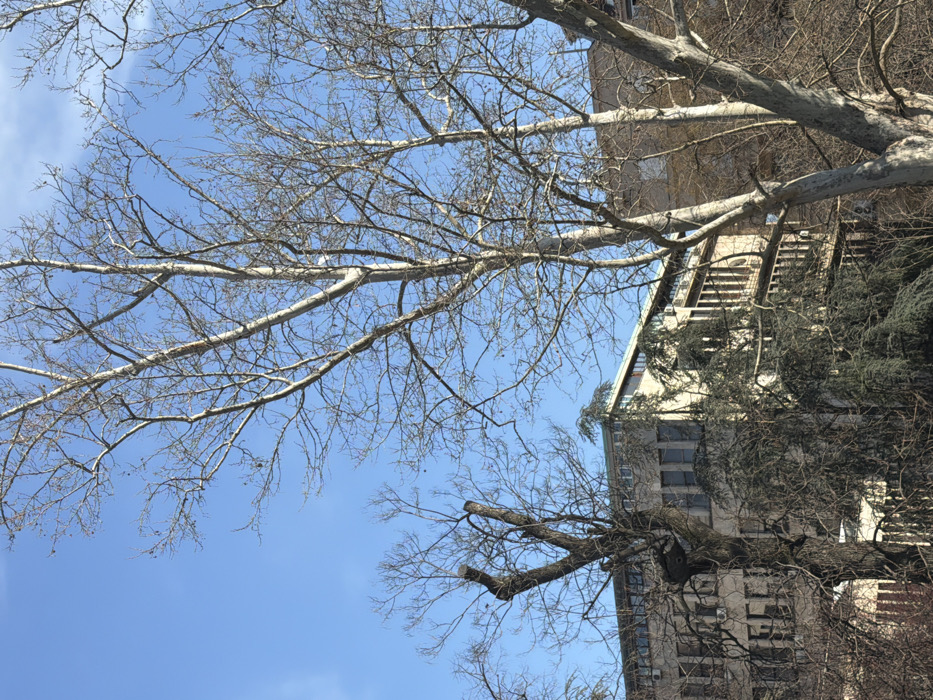 The image displays an exterior view of the Faculty of Philology building, located at Studentski trg 3, Belgrade, Serbia, under a clear blue sky. The multi-story structure features a light-colored facade with numerous rectangular windows, some of which are recessed with visible railings and external air conditioning units. A distinctive light green parapet or trim lines the flat roof. In the foreground and midground, several mature deciduous trees dominate, exhibiting bare branches consistent with winter or early spring dormancy. One large deciduous tree on the left side of the frame shows clear evidence of substantial pruning. Evergreen foliage is visible closer to the building's base, partially obscuring the lower floors. No individuals or active subjects are discernible within the frame.