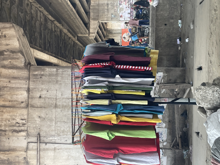 The scene depicts an urban environment beneath a concrete overpass in Aiyetoto-Asogun, Nigeria. In the foreground, a metal clothing rack holds approximately 35-40 short-sleeved T-shirts of various solid colors, including red, light green, yellow, blue, black, grey, white, and maroon, suspended on multi-colored plastic hangers. The rack's central support pole has a black strap wrapped around it, with a small white paper attached. The immediate ground is uneven concrete, strewn with rocks and white plastic debris. A low concrete wall extends horizontally across the mid-ground. To the right of the clothing rack, an individual wearing a light blue top and dark bottoms is seated on a black motorcycle, facing left. Next to the motorcycle, another individual in a light pink/tan short-sleeved top and dark bottoms stands, also facing left. Several other motorcycles are parked further into the mid-ground. The background features massive, weathered concrete pillars and the underside of the overpass structure, exhibiting discoloration and visible formwork lines. A lower concrete wall behind the individuals is heavily plastered with numerous torn, faded posters and flyers, partially obscuring a red and orange banner. The ground throughout the visible area is concrete, marked by debris and general wear. No direct interactions between individuals are discernible.