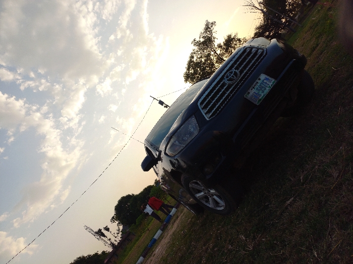 The image depicts a dark-colored Toyota Highlander SUV, generation XU20, parked on a grassy incline in an open area. The front of the vehicle is visible, displaying a chrome grille with a Toyota emblem, headlights, and a Nigerian license plate, "ABUJA BML-590FN," affixed to the front bumper. Silver multi-spoke alloy wheels are visible on the vehicle's front left side. In the mid-ground, three individuals are present. One person wears a white shirt and dark trousers, another wears a red shirt and dark trousers, and a third individual is partially obscured. They are standing near a low, striped barrier painted with alternating blue and white sections. The environment includes dry grass covering the ground, scattered trees, and a tall metallic lattice tower, consistent with a telecommunications mast, visible in the distant background on the left. A thin, dark overhead line traverses the upper left portion of the sky. The sky is partly cloudy, illuminated by a low sun, suggesting late afternoon or early evening. The scene is located within Kuje, Federal Capital Territory, Nigeria, as confirmed by the vehicle's registration plate.