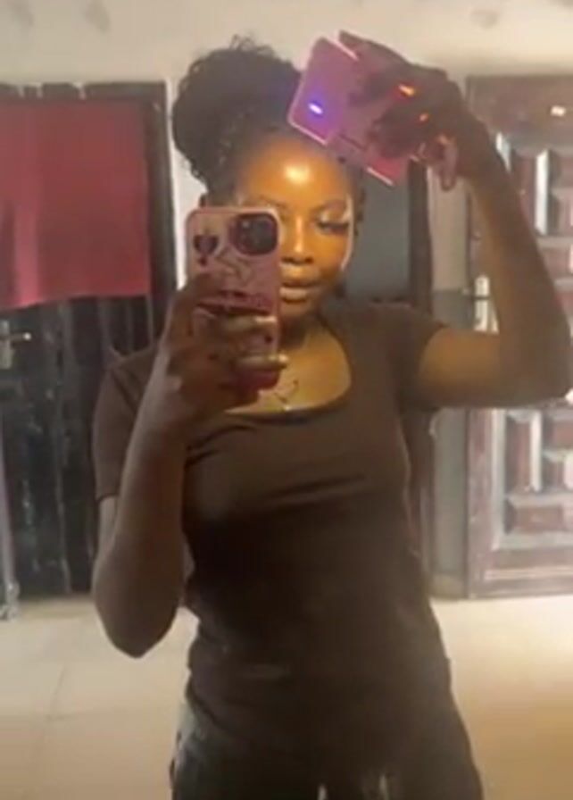 A young woman takes a selfie in front of a mirror while holding a small, pink, rectangular object above her head. She has dark skin, wears a dark brown T-shirt and dark colored, patterned pajama pants. Her hair is styled in an updo. She smiles and looks at the phone in her hand. The rectangular object has lights visible. A colorful speaker is visible on a counter near the bottom of the frame. A red towel hangs on a door behind her. The tiles on the floor are tan.