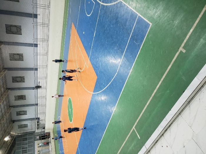 An indoor court with green, blue, and orange sections is visible, marked with white lines. Several people are standing on the court, seemingly engaged in a practice session or game. The court is inside a building with a white and gray wall featuring rectangular openings. The lighting is slightly dim, and the perspective gives a wide view of the court and its surroundings.