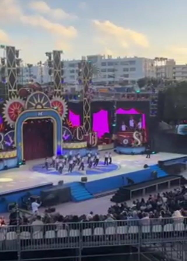 large outdoor stage decorated with circus-themed props, including the word "Circus." A group of dancers dressed in black and white are performing on the stage. The audience is seated in rows in front of the stage, and the buildings and trees can be seen in the background. The sky is blue with scattered clouds.