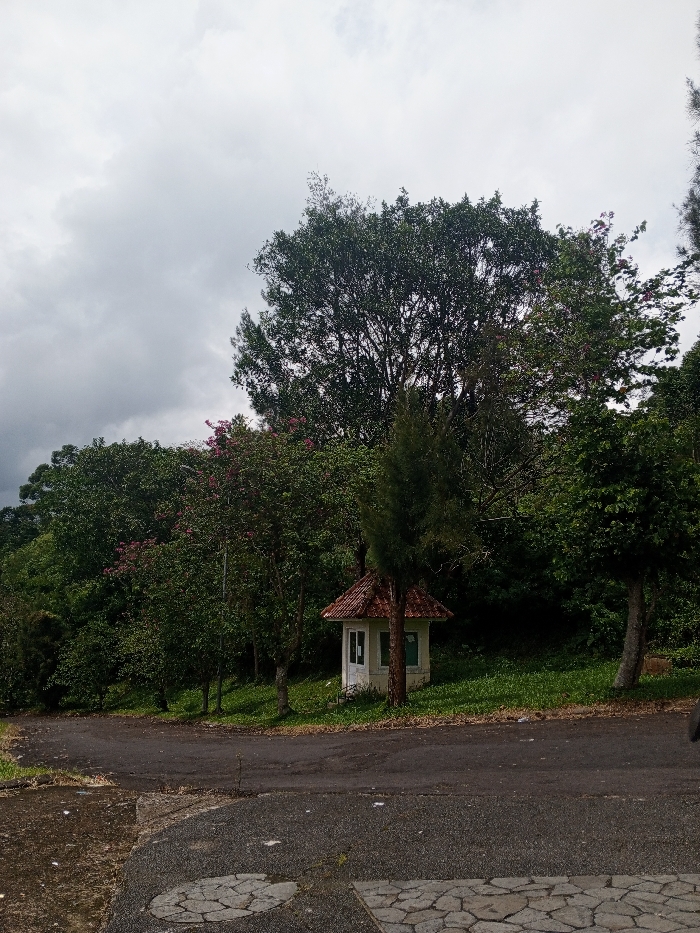 A small, white building with a red-tiled roof sits at the edge of a road in a natural setting. Lush green trees surround the structure, and the sky overhead is overcast with gray clouds. The road leading up to the building is paved, with a section featuring stonework near the foreground. The overall scene is tranquil, despite the overcast sky.