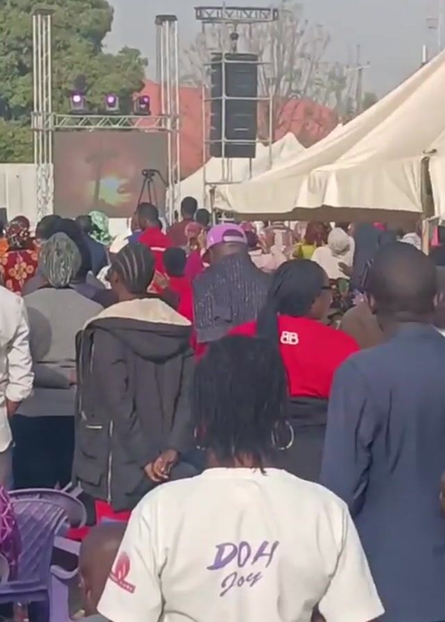 large crowd gathered outdoors in front of a stage where a group of people are performing. The people on stage are wearing robes. The crowd is diverse, with people of different ages and wearing varied clothing. Some people are facing the stage, some are sitting on chairs, while others are standing. There are white tents set up near the stage. The weather appears sunny and clear. The camera moves through the crowd, showing different perspectives of the stage and the people attending the event.